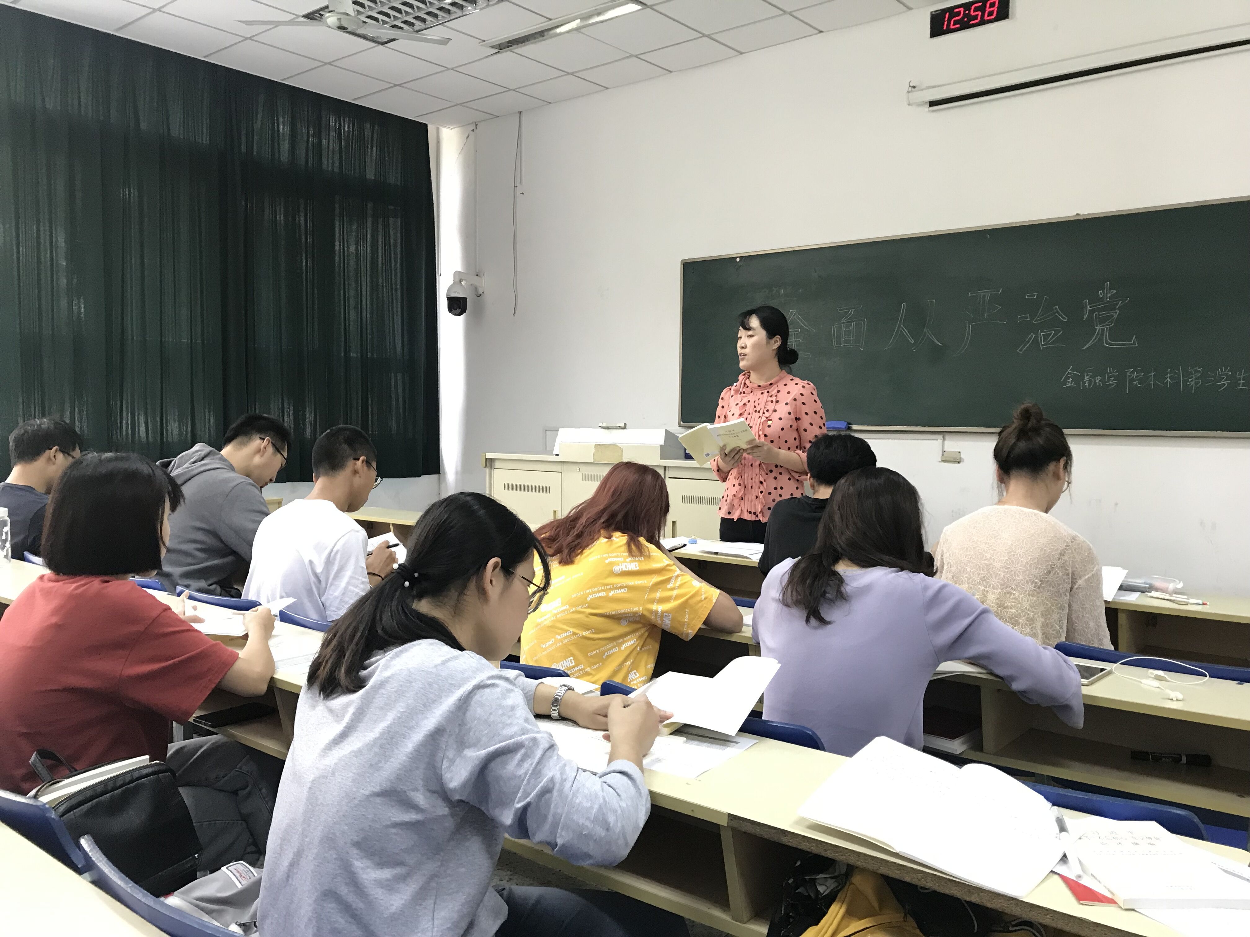 首先,庞威老师带领全体同学学习了“全面从严治党”的相关文件精神,研读了《习近平新时代中国特色社会主义思想学习纲要》。进一步了解到全面从严治党是党的十八大以来党中央作出的重大战略部署,是“四个全面”战略布局的重要组成部分,也是全面建成小康社会、全面深化改革、全面依法治国顺利推进的根本保证。