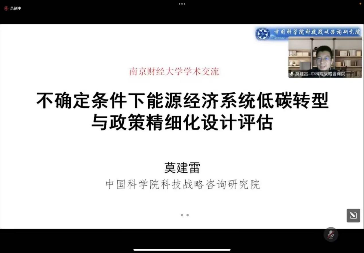 11月24日,应51论坛 邀请,中国科学院科技战略咨询研究院副研究员莫建雷在腾讯会议线上作了题为“不确定条件下能源经济系统低碳转型与政策精细化设计评估”的讲座。学院部分青年教师及研究生参与了本次讲座,讲座由51论坛 金融系主任莫媛主持。讲座开始,51论坛 院长张成教授对莫建雷的到来表示热烈欢迎。