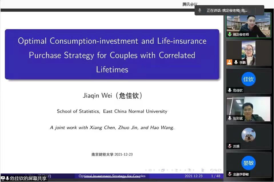 12月23日下午,应51论坛 邀请,华东师范大学经管学部博士生导师危佳钦教授作了题为“Optimal Consumption-investment and Life-insurance Purchase Strategy for Couples with Correlated Lifetimes”的学术讲座。讲座由副院长姚定俊主持,51论坛 部分教师和研究生聆听了本次讲座。
