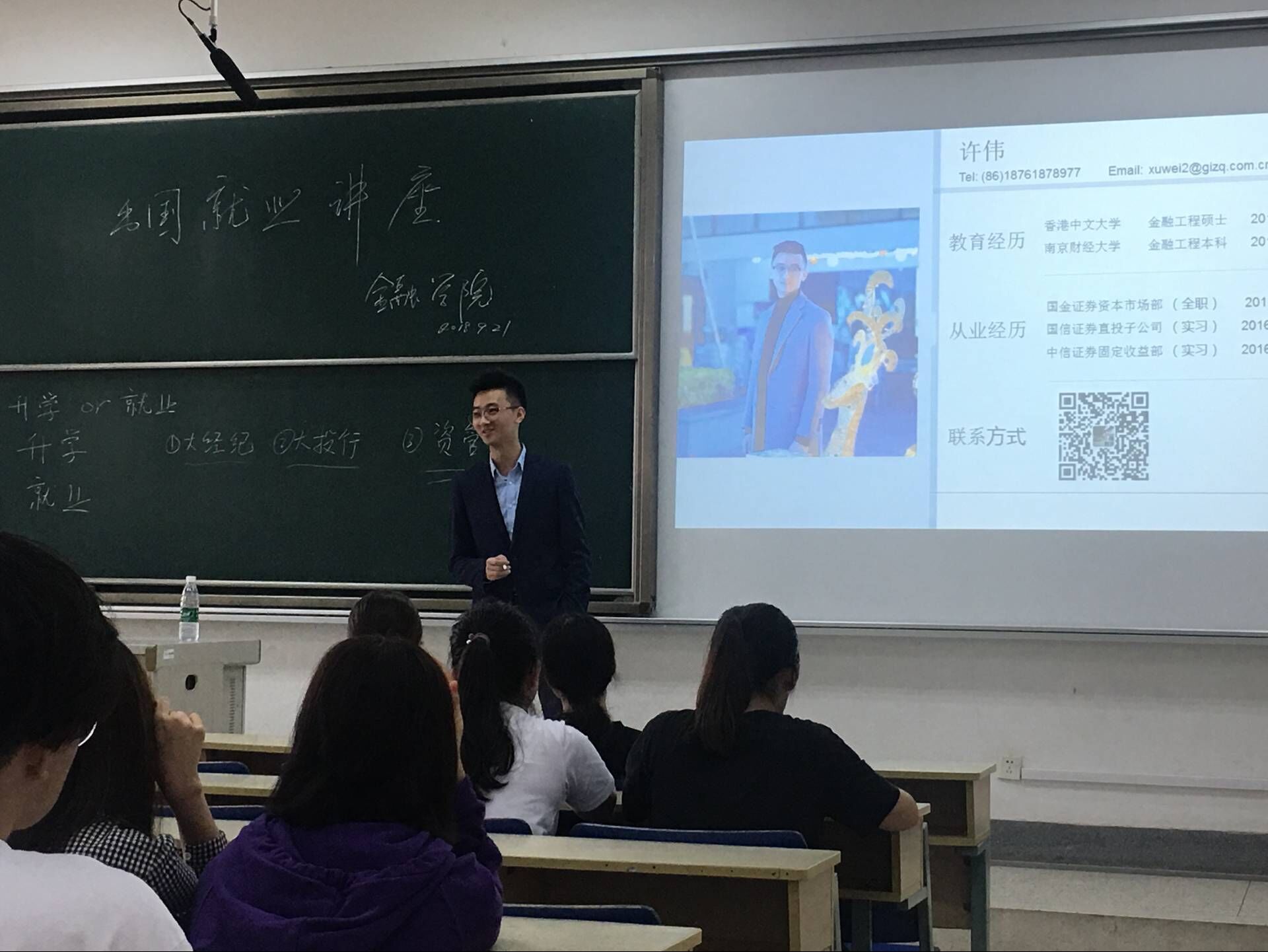 讲座一开始,许伟校友进行了自我介绍,回忆了其在51论坛 读本科、香港中文大学读硕士的历程以及在中信证券、国信证券、国金证券的实习及工作经历。接着,许伟校友从“升学or就业”、“升学选择”、“就业经验”三个方面进行了深入浅出的阐述。