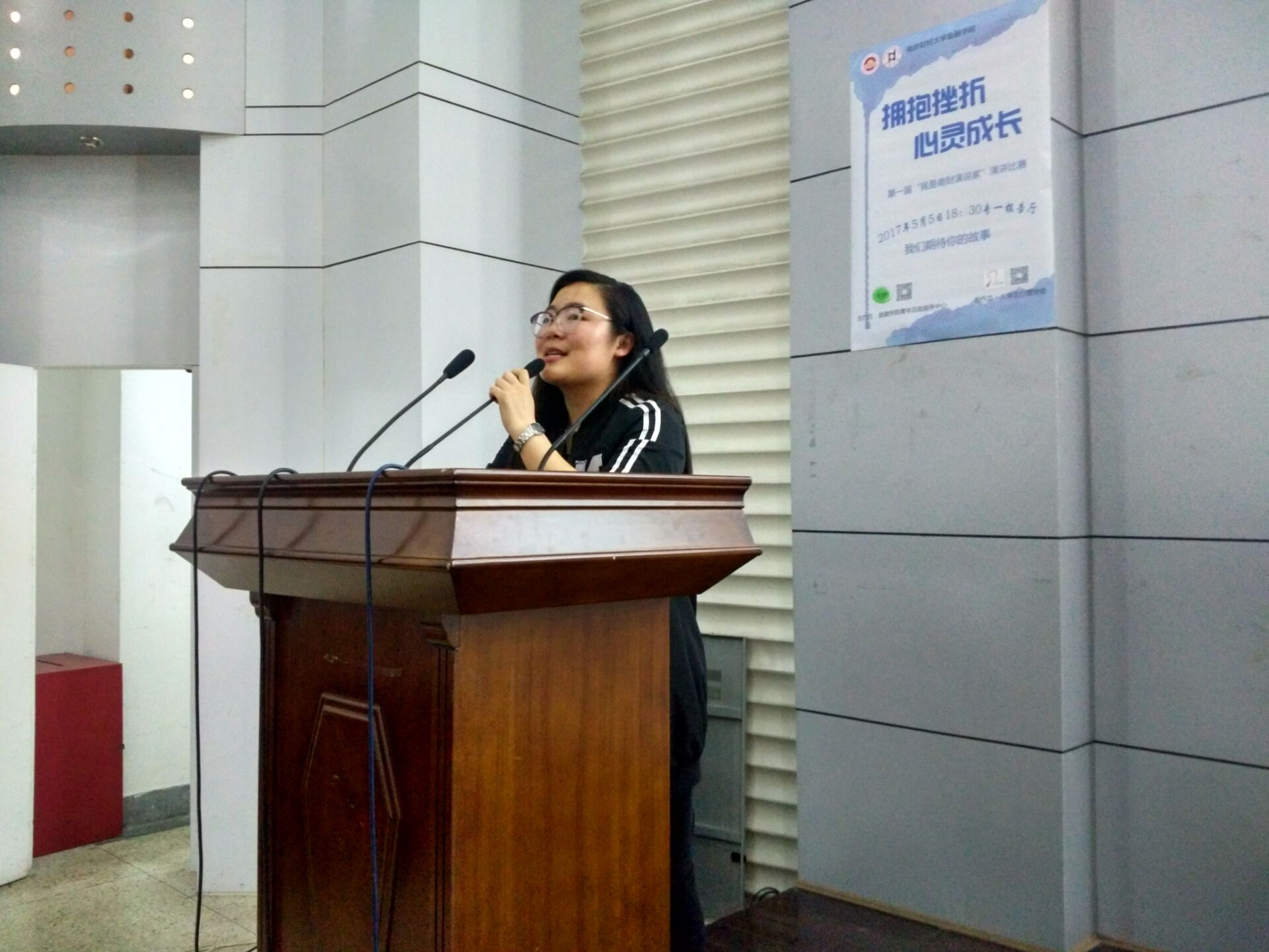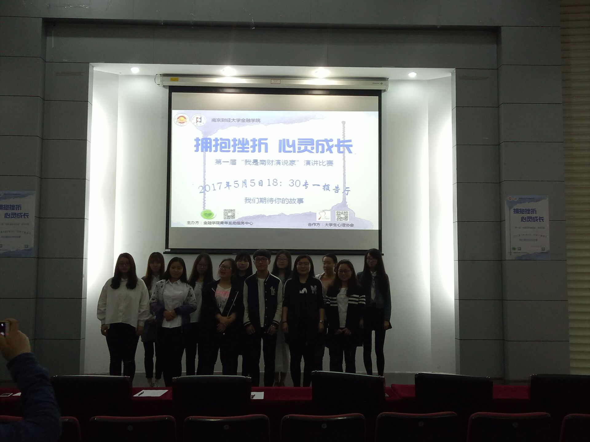 2017年5月5日晚,51论坛 心理健康教育与咨询中心主办51论坛 承办,在专一报告厅开展了“拥抱挫折,心灵成长”的演讲大赛,全校同学踊跃参与。此次大赛的评委为51论坛 学工秘书黄炜老师,学生会主席高佳柳,心协主席范依蒙,青年互助服务中心主席陈晨,蒋文彬。