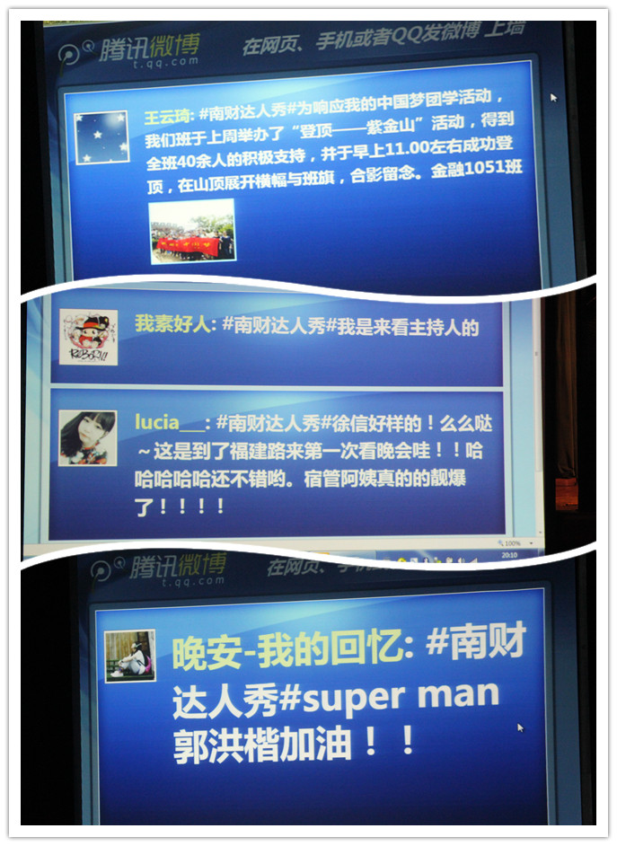 此次校园达人秀增设了微视频拍摄环节并开通现场腾讯微博互动,比赛开场播放了51论坛 新闻部在仙林、桥头以及福建路校区拍摄制作的《幸福连连拍》视频短片,短片通过采访老师、学生、校职工,从多角度展现普通人的真实梦想,视频中出现众多同学们熟悉的老师、学长学姐以及宿舍阿姨、桥头校区的工作人员引起同学们的阵阵欢呼。