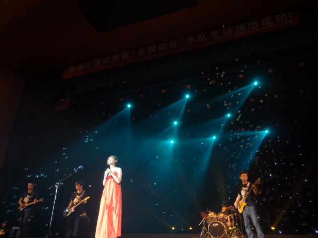 随着激情四射的《It’s my life》以及《王子的新衣》的演唱,此次“金属公社”乐队专场演唱会正式开始,全场气氛瞬间被激情的演唱以及绚烂的灯光调动起来。接着,宋蔚倾情演唱《夜空中最亮的星》、《starlight》,台下观众掌声如雷。随后,Miss Mix乐队为大家带来了《young for you》和《突然想到理想这个词》,主唱幽默的表演让大家欢笑不断,也带动了现场的气氛。由篮球宝贝带来的热舞妩媚动人为晚会掀起阵阵高潮。“金属公社”主唱张一诺以一首《寻水的鱼》开场,接着向大家介绍了“金属公社”乐手,又现场弹唱了《宝贝》和《玫瑰色的你》。十佳歌手王琦的《头号粉丝》和《闷》赢得台下观众阵阵欢呼。乐队专场演唱会进入游戏环节,观众积极踊跃参加游戏。调音师傅演唱了一首《风吹麦浪》,让大家感受到了别样风采。随后,“金属公社”乐队带来了原创曲目《Tonight she’s alone》,接着又演唱了《Fairy Tale》,让大家意犹未尽。最后吉他手梅校容以一首《恋爱ing》为此次专场划上了圆满的句号。